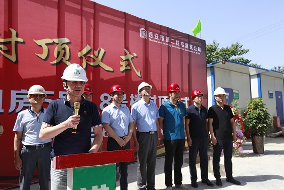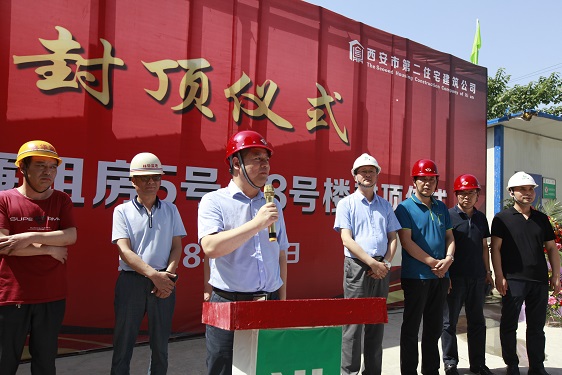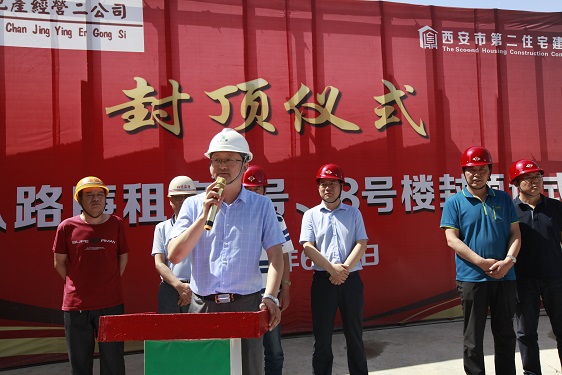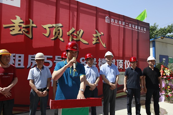 在封頂儀式上,經(jīng)營二公司經(jīng)理董文軍對參與該項(xiàng)目的施工方、監(jiān)理方和勞務(wù)方的工作表示了衷心的感謝;林華監(jiān)理代表對5#、8#樓的施工質(zhì)量、進(jìn)度、安全等方面予以充分的肯定,并對5#、8#樓春節(jié)前搶抓進(jìn)度,創(chuàng)造月進(jìn)度5層半的成績表示贊嘆;市局領(lǐng)導(dǎo)強(qiáng)調(diào)丈八路廉租房項(xiàng)目在后期建設(shè)中,要繼續(xù)發(fā)揮5#、8#樓作風(fēng)過硬、技術(shù)過硬的優(yōu)勢,在保證安全和質(zhì)量的前提下?lián)屵M(jìn)度,保質(zhì)量。房管處劉振龍?zhí)庨L特別提出兩個(gè)具體要求:一是安全生產(chǎn)的重要性,要時(shí)刻保持警惕,一刻不得松懈;二是要注意治污減霾和施工噪音擾民的問題,要注意防塵覆蓋和定時(shí)噴淋,高考中考時(shí)間停止夜間施工,為保衛(wèi)西安藍(lán)天做貢獻(xiàn),為廣大學(xué)子營造良好學(xué)習(xí)休息環(huán)境。