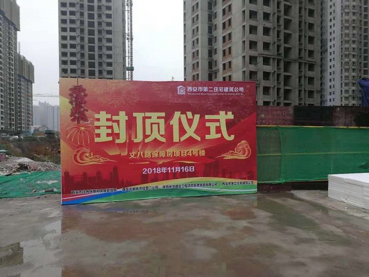 11月16日星期五丈八路保障房項目的施工現場,禮炮在片片雨云中炸響,鞭炮粘著雨花淅淅的散落著,雖然下著小雨,但是現場依舊人山人海,熱鬧非凡;10點50分隨著項目指揮長邢京平同志的聲音響起,丈八路項目封頂儀式正式開始。丈八路保障房項目4號樓主體順利封頂,標志著丈八路項目再一次完成了重要節點性的施工任務,這是所有現場施工人員堅持不懈的努力下共同完成的勞動成果;開發單位西安市經營二公司書記王備戰同志在講話中對現場施工人員的工作予以高度肯定,并再三叮囑大家要再接再厲完成好后續工作,參加本次活動的還有建設單位各級領導,監理單位總監及各專業工程師,施工單位西安市第二住宅建筑公司副經理杜軍、技術總工劉琪、指揮長邢京平、現場負責人陳衛民及各級現場施工人員。
